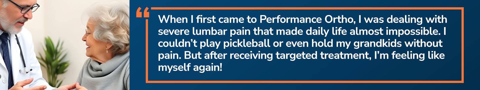 I’ve received treatment elsewhere in the past, but nothing compares to the personalized care I received at Performance Ortho. The team took the time to understand my needs and created a treatment plan tailored just for me. It’s not just the treatments, it’s the incredible team at Performance Ortho that made the difference. They made me feel heard, cared for, and most importantly, better!